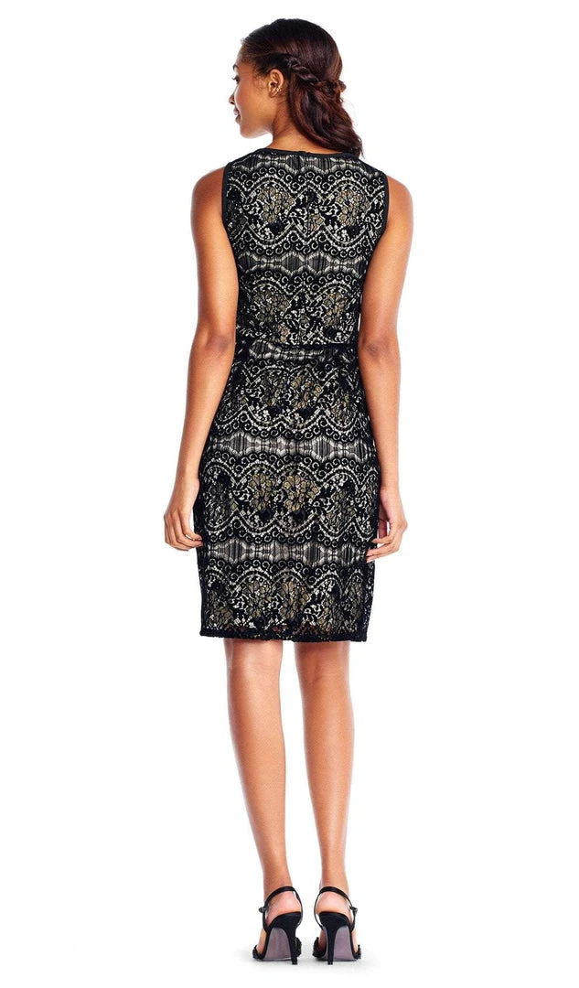 Dress to the nines in this glam dress by Adrianna Papell AP1D101560. Shows off in a sleeveless, jewel neckline with fitted bodice made of velvet and lace fabric. The skirt has a fitted silhouette and runs at knee length hem. Optimize the attraction of your special event in this alluring dress by Adrianna Papell.