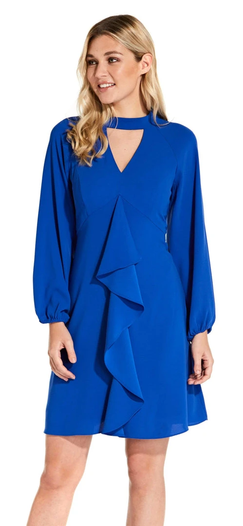Dance and enjoy your next special party or event in this short, sassy and stylish dress by Adrianna Papell AP1D103006. This A-line dress showcases long bishop sleeves, a keyhole mock-neckline, and a ruffled corkscrew accent down the front. Crafted in lightweight crepe, this dress makes a comfortable look for all day wear. The full back is secured with a center zipper closure. This dress by Adrianna Papell is simply captivating.