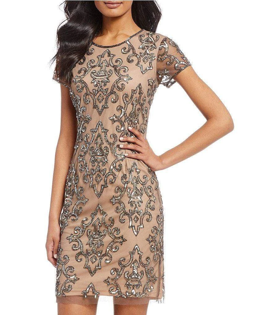 Keep it simple and classy at your upcoming social event in this charming Adrianna Papell AP1E202291 cocktail dress. This dress is fully embellished with a fitted bodice framed with a jewel neckline and sheer short sleeves. The skirt features a sheath silhouette that tapers to the mid-thighs as the full back is secured with a center zipper closure detail. Be unique and outstanding in this Adrianna Papell ensemble.