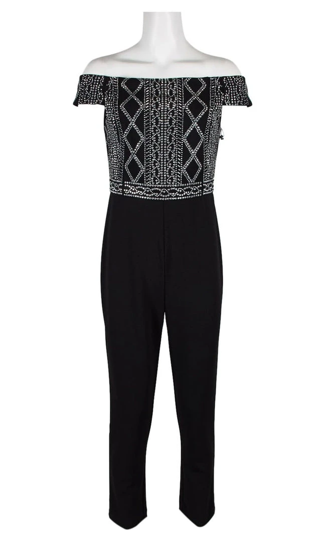 Fill the room with warmth and light in this radiant style by Adrianna Papell AP1E206601. Captivates in a glittering off-shoulder neckline with bodice richly ornate with embellishments. The bottom is tailored in a pair of long fitted leg pants. Be ready to sparkle in style in Adrianna Papell.