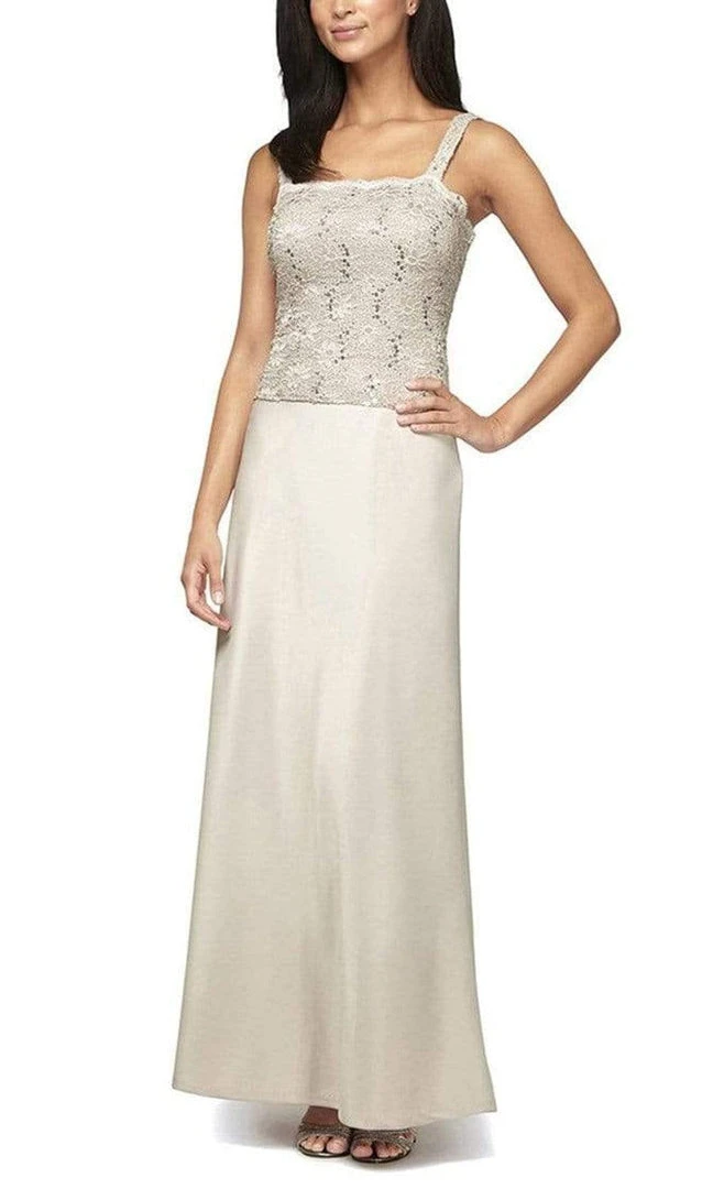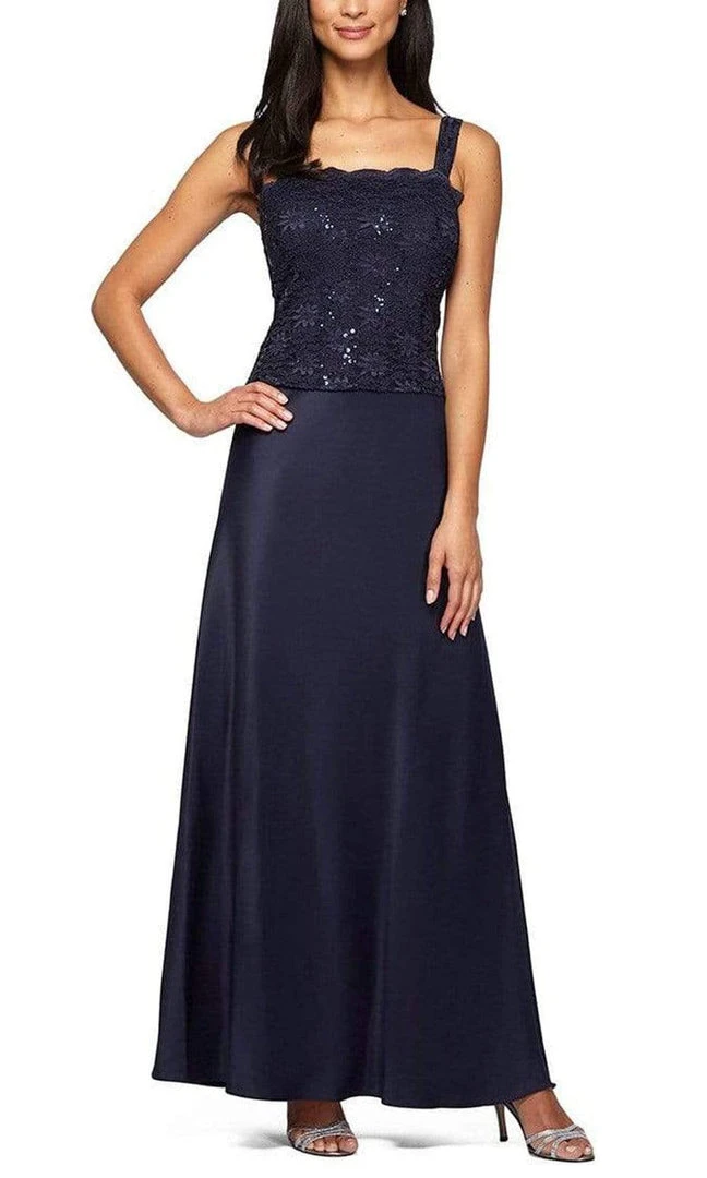 Create beautiful moment in this gorgeous Lace and Chiffon gown by Alex Evening 1121198. A two-piece set long formal dress, showcasing a sleeveless tank top bodice in embroidered lace with a matching scallop-edged sheer lace jacket with slender three-quarter length sleeves. Completing the elegant look is its solid chiffon skirt that will let you parade in a full-length A-line silhouette. This design by Alex Evening is all set to make that evening your extra special!