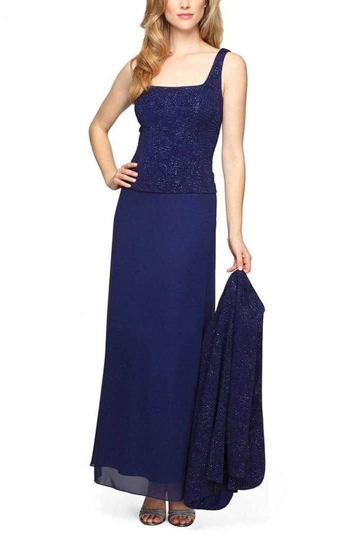 This enchanting Alex Evenings 125053 is sure to make you the center of everyones attention. This dress that features square neckline on top and a flowy chiffon fabric on the skirt is cut into column silhouette. It has a detachable jacket using jacquard knit with formal mandarin neckline. Exhibit your softer side in this delightful evening gown by Alex Evenings.
