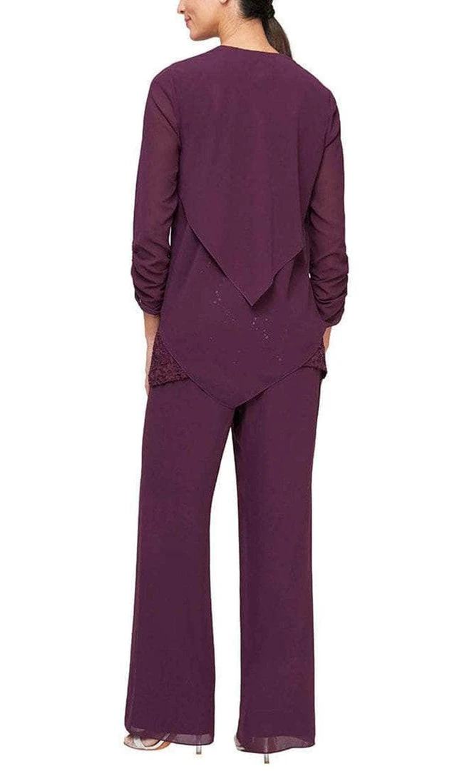 Be effortlessly beautiful when you show up in this Alex Evenings 8192002 creation. Accentuated by a sleeveless scoop neck inner adorned with intricate beadwork, paired with a long-sleeved jacket, tank and pant set will be your go-to outfit for many occasions. The relaxed silhouette sits away from the body, skimming curves and the lightweight chiffon lined pants are comfortable and breezy. Perfect to pack for vacation, cruise, or destination wedding. Claim that look of sophistication wearing this classy Alex Evenings masterpiece. Model is wearing Navy, and Raisin colors.