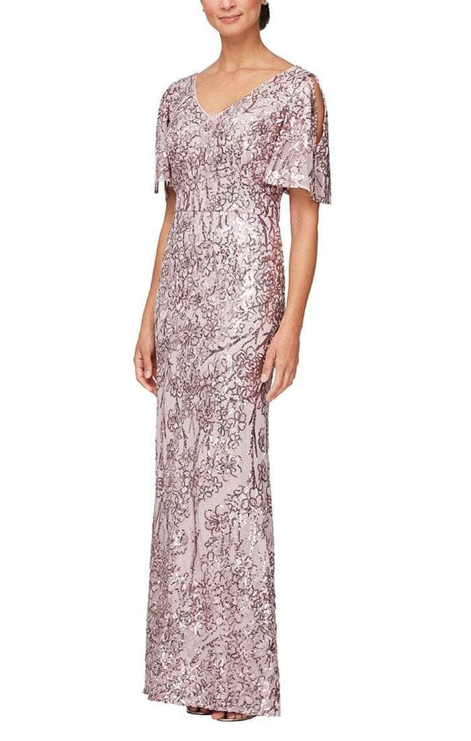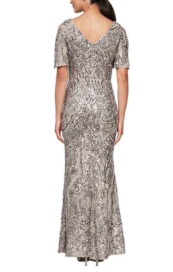Sparkle in beauty wearing this Alex Evenings 8196611 evening gown. Shimmering sequins embellished dazzles this full-length A-line silhouette gown, brandishing a V-neckline, cold shoulder with short flutter sleeves. This floral pattern gown reveals a modest V-shaped back and back zipper closure. Be ready to mesmerize the night in this Alex Evenings masterpiece.
