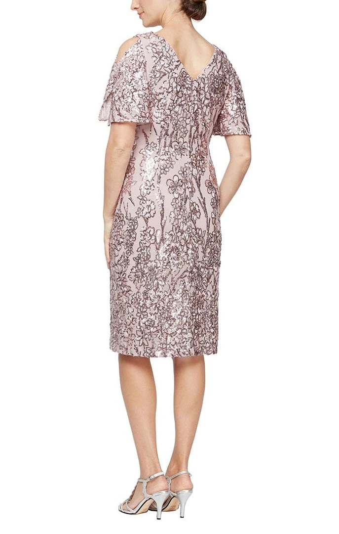 Glamour gets gorgeous with this Alex Evenings 8196728 dress. This all-over floral sequin dress showcases a V-neckline and short flutter sleeve with a cold shoulder. This knee-length dress also highlights a V-shaped cut and center zipper closure. This Alex Evenings style is sure to create a striking look that is sure to make anyone remember your grand entrance.