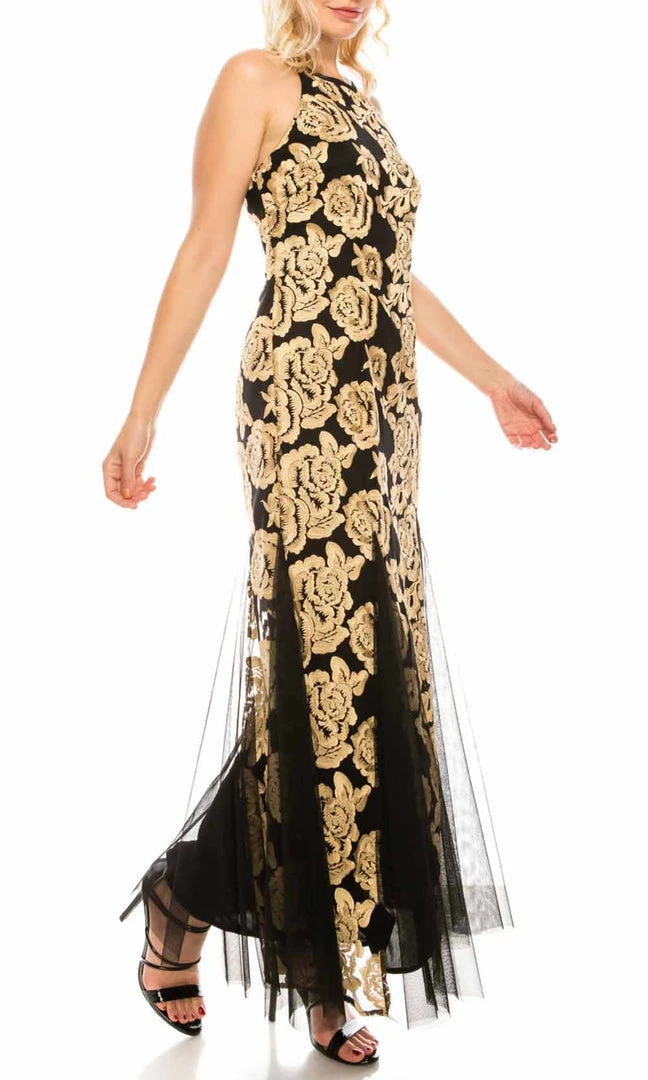 Be the center of attention in this glamorous Alex Evenings 8217673. This gorgeous halter neck dress features an exceptional allover gold floral embroidery and a mesh-inserted godet skirt. Commence a new chapter of your journey to forever in this fascinating Alex Evenings creation.