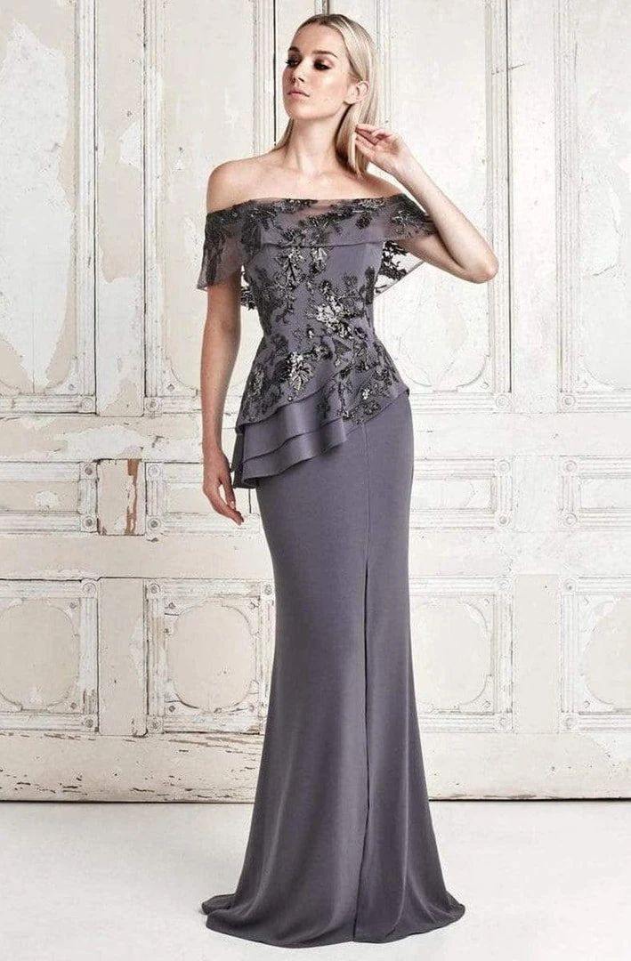 This gown features an off-shoulder sheer neckline with folded detail. The fitted bodice is adorned with seams. Embroideries beautify the top and cascades to the three tiered asymmetrical peplum. Fitted through the hips, the skirt flares slightly to the floor in a sheath silhouette. Models are wearing Slate and Buff colors.