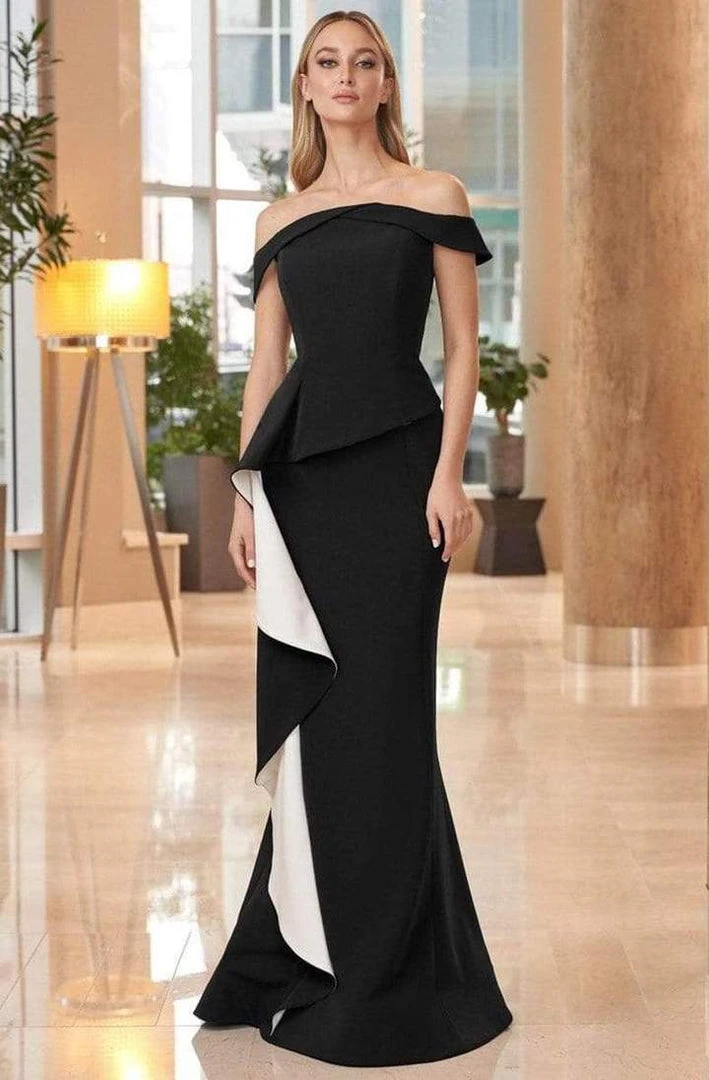 | Details: | Off-shoulder, Ruffles, Fitted bodice, Long trumpet gown, Soft crepe fabric, Back buttons |