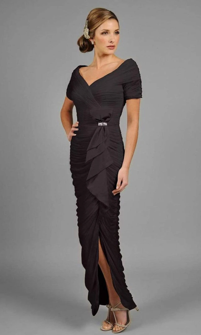 Designed with fine shirring that extends to the entire silhouette.åÊThis gownåÊshows an off-shoulder necklineåÊwith short sleeves. A surplice treatment is decorated with a draped bowåÊonåÊa jeweled band. The full-length sheath skirt completes down to a tulip hemline.åÊ