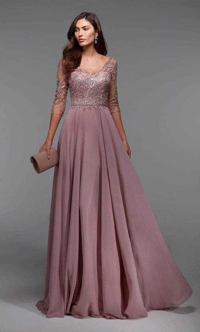 Dance the night away in this flattering Alyce Paris 27475 creation. Impressively ornamented with embroidery and beadwork, this dress reveals a v-neckline with sheer quarter sleeves. The back has a v-open style and a zipper closure. The skirt streams to the floor with a train. Attract attention in this fabulous Alyce Paris masterpiece.