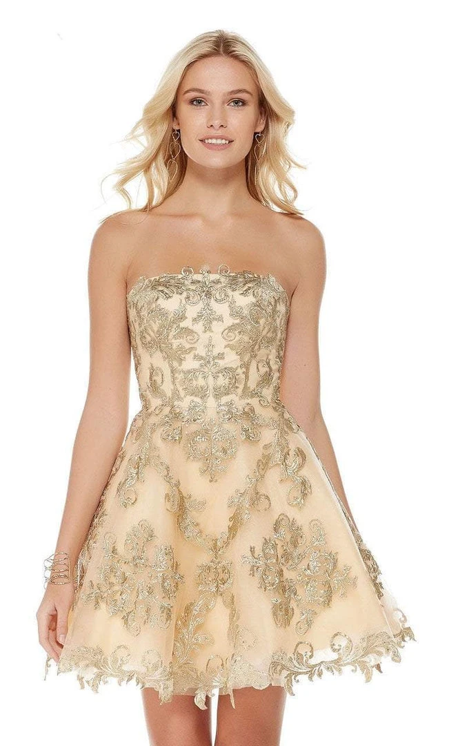 Define feminine beauty as you glide on the dance floor in this exquisitely-made Alyce Paris 3762 creation. Accented with metallic lace appliques, this stunner flaunts a strapless straight-across neckline paired with a sexy lace up back. Accented with frilled trims, the A-line dress flares into a gossamer short hemline. Make them turn their heads toward your direction in this captivating Alyce Paris masterpiece. Model is wearing the Gold color.