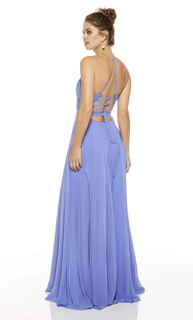 Sparkle in beauty wearing this Alyce Paris 60637. Show them your soft side in this long dress that features plunging neckline on a fitted and embellished bodice while the back is styled with lace-up open back. The soft skirt is made with soft tulle fabric and uses A-line silhouette. Leave a trail of admirers as you glisten in beauty in this Alyce Paris masterpiece. Model is wearing Blue Iris color.