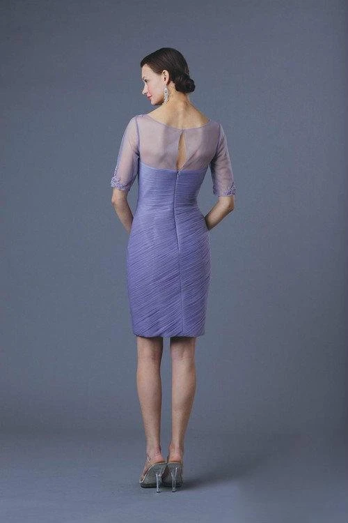 Soft tulle slim fit dress features sheer beaded embroidered lace sheath over asymmetrical pleated short dress, sheer scoop neckline over sweetheart bodice, sheer short sleeves, and sheer back with keyhole opening.