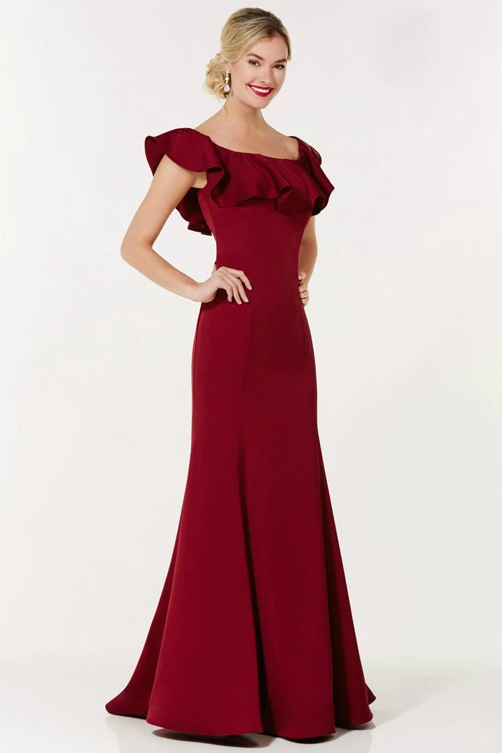 Form fitting stretch crepe gown with an off the shoulder ruffled neckline, button up back, and a slight tail.
