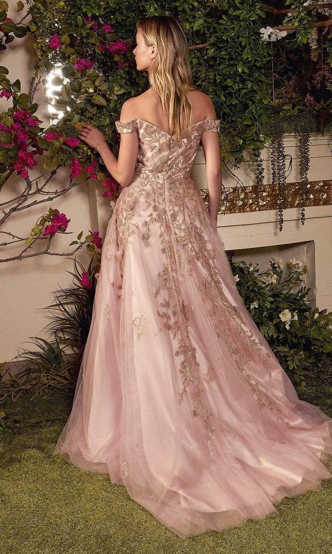 Make a memorable splash at your upscale evening in this lux formal gown by Andrea and Leo A1056. Flatteringly ornamented with floral and sequin appliques, this gown showcases an off-shoulder and plunging sweetheart neckline with a sheer inset at the bust. The midrise back is accented with a zipper closure while the ballgown skirt flows down into a court train. This Andrea and Leo masterpiece is sure to make you the darling of the party!