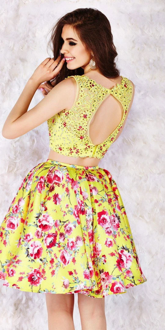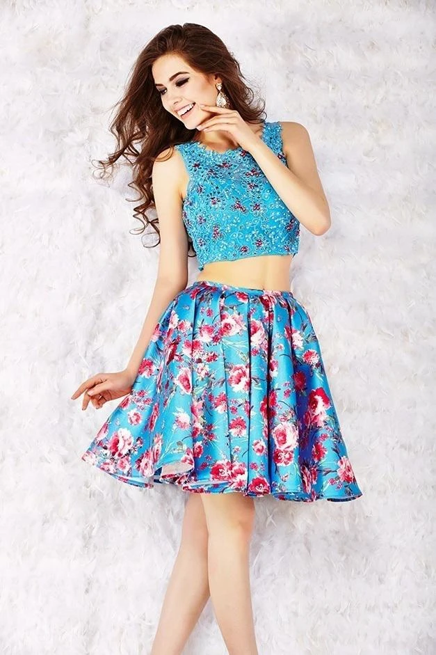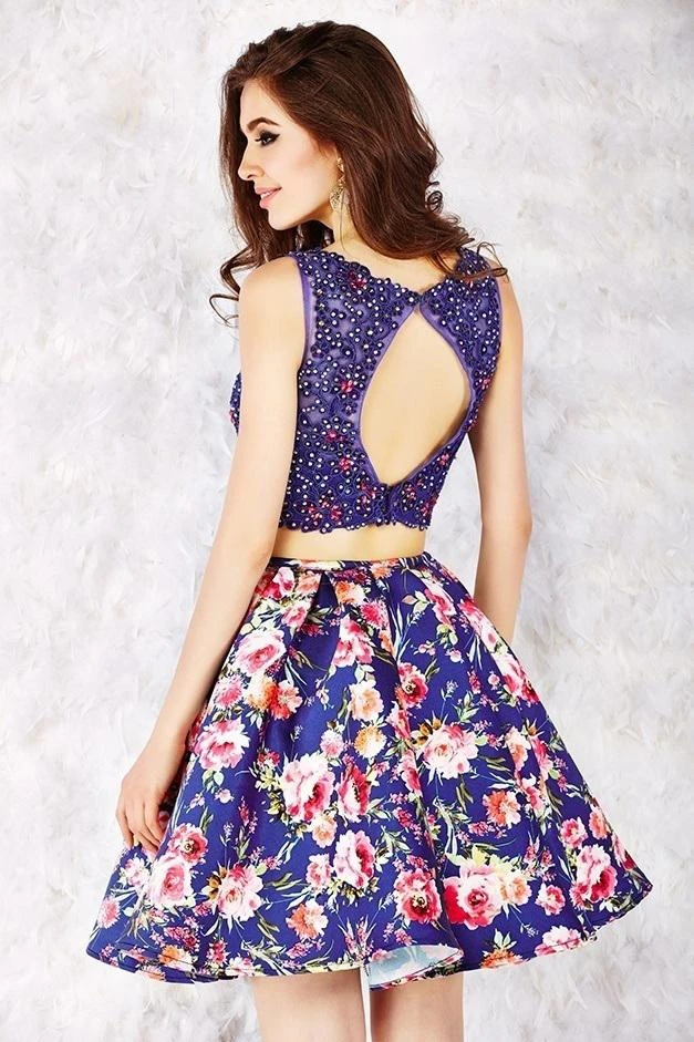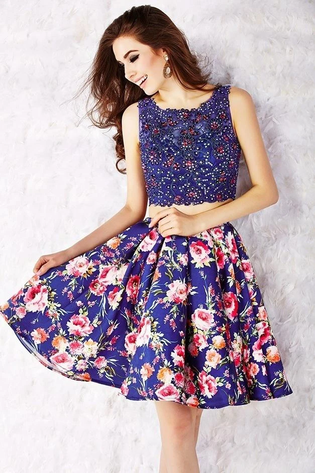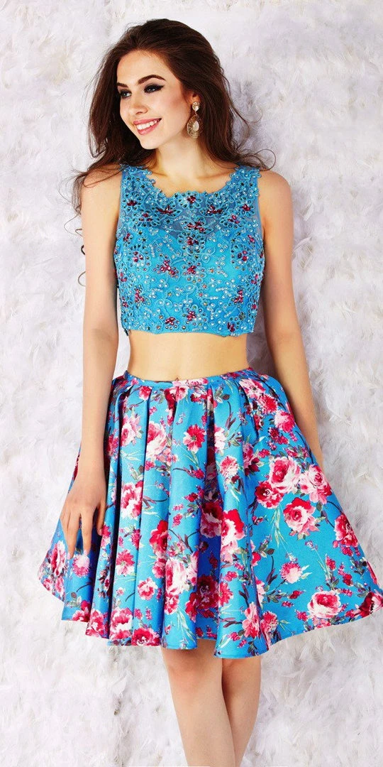 Be the star of any garden party or homecoming with this attractive two piece homecoming dress featuring a cheerful floral pattern. Two pieces are hot in the fall collection and this halter and short flared skirt will have you feeling confident and sexy.
