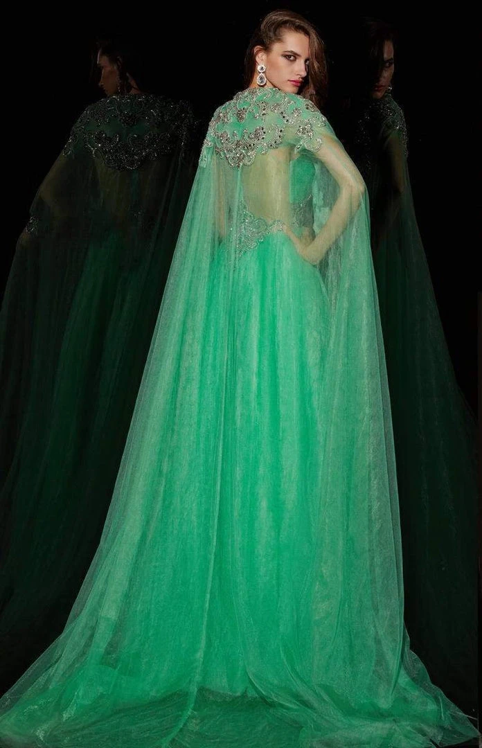 Floor length beaded tulle cape.