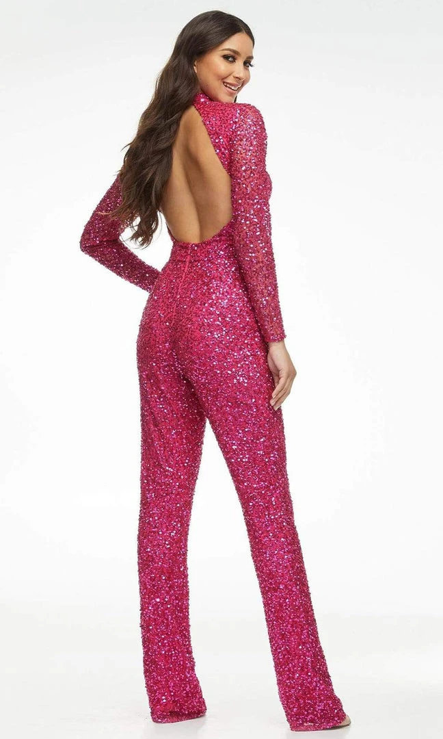 Get glamorous look with this Ashley Lauren 11077 jumpsuit. This jumpsuit highlights a high neckline supported by long sleeves in a fitted and sequin embellished bodice. This also shows an open back with back zipper closure to complete the look. Promote attention-grabbing style in this stunning Ashley Lauren creation.