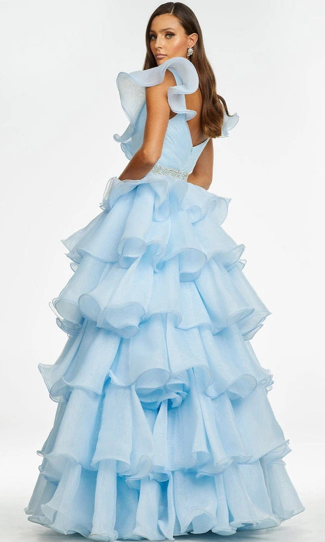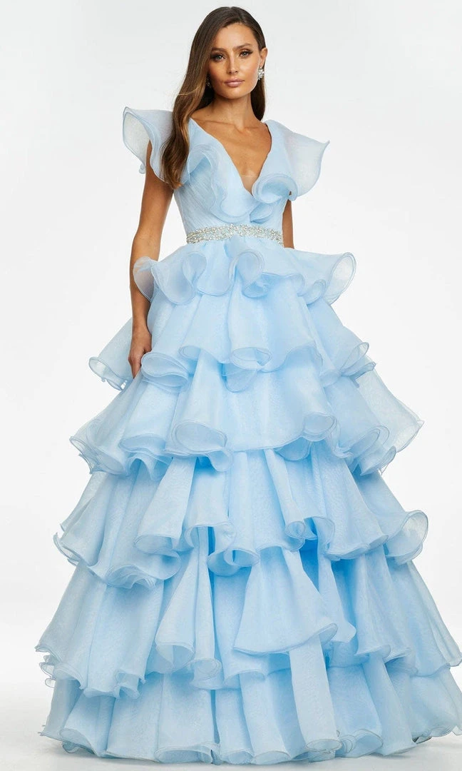 Look like an absolute beauty in this tantalizing Ashley Lauren 11154 creation. Astoundingly draped with a ruffle foldover detail, this gown parades a deep v-neckline with a v-open back on a pleat-ornate bodice. Accented with a beaded waist, tiers of ruffled organza cascades to the floor with flair. Dress to impress in this elaborately rendered Ashley Lauren masterpiece. Model is wearing the Sky color. Ashley Lauren is one of the most popular brands to look for this year offering endless options in special occasion dresses.