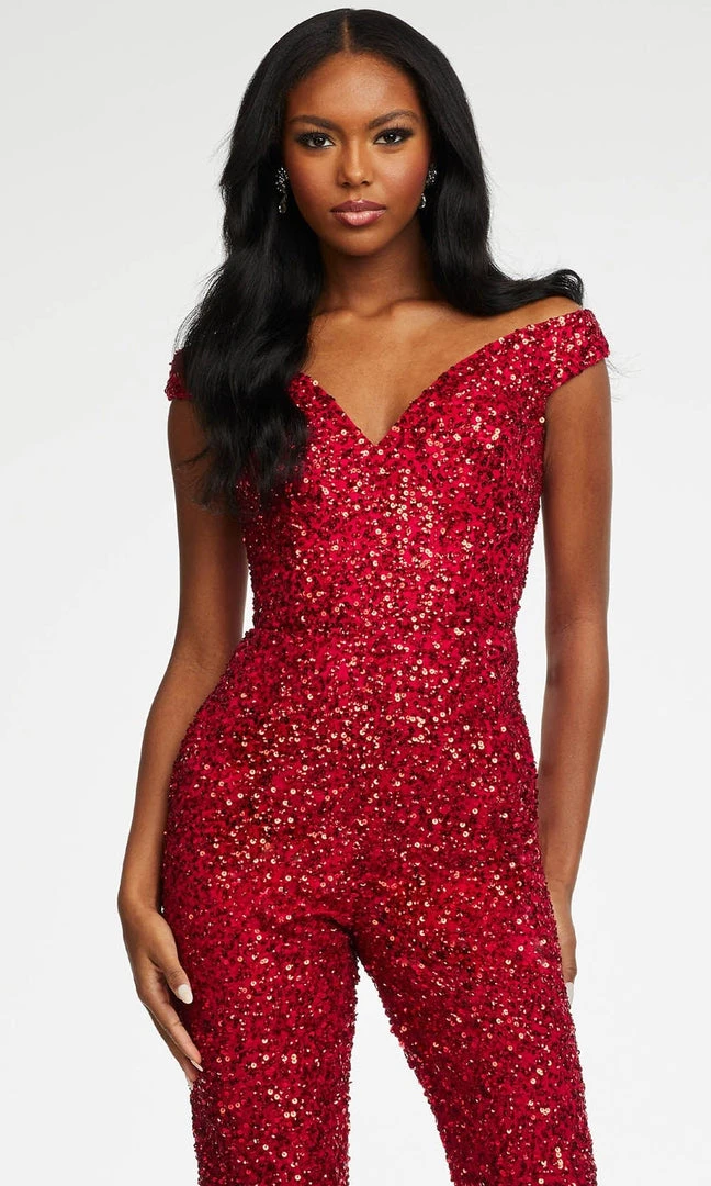 Make a statement in this iridescently styled Ashley Lauren 11175 creation. Festooned with a crust of sequins allover its length, this piece features an off shoulder neckline with a sweetheart bodice. Featuring a midrise back with a zipper closure, the jumpsuit fits and completes with a straight leg pants. Leave everyone impressed with the glow of this Ashley Lauren masterpiece. Ashley Lauren is one of the most popular brands to look for this year offering endless options in special occasion dresses.