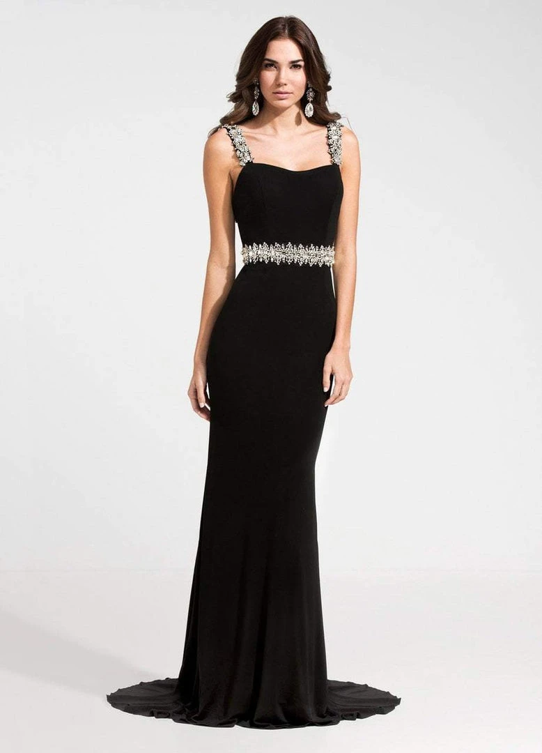 Accentuate your waist in this jersey evening dress by Ashley Lauren 1127. The straps and belt are adorned with rhinestones that draw attention to the waist giving you the perfect silhouette. The back has a low V-cut while the sheath skirt finishes in a sophisticated train. Make them look in this lavish dress by Ashley Lauren.