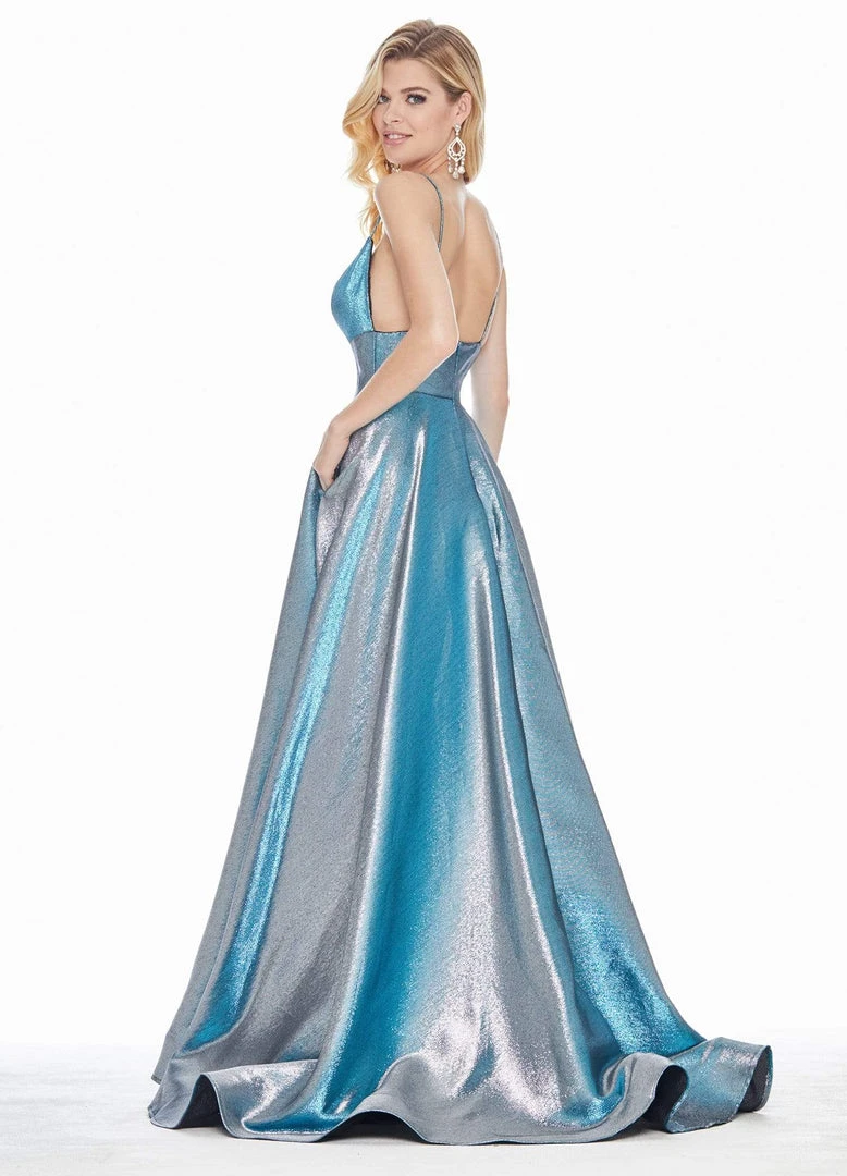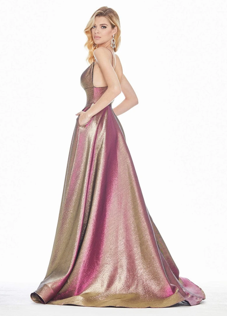 | Details: | Sleeveless, Spaghetti Straps, Two-Toned Metallic Brocade, Inseam Pockets, Mid-Open Back, Back Zipper Closure, Sweep Train |
