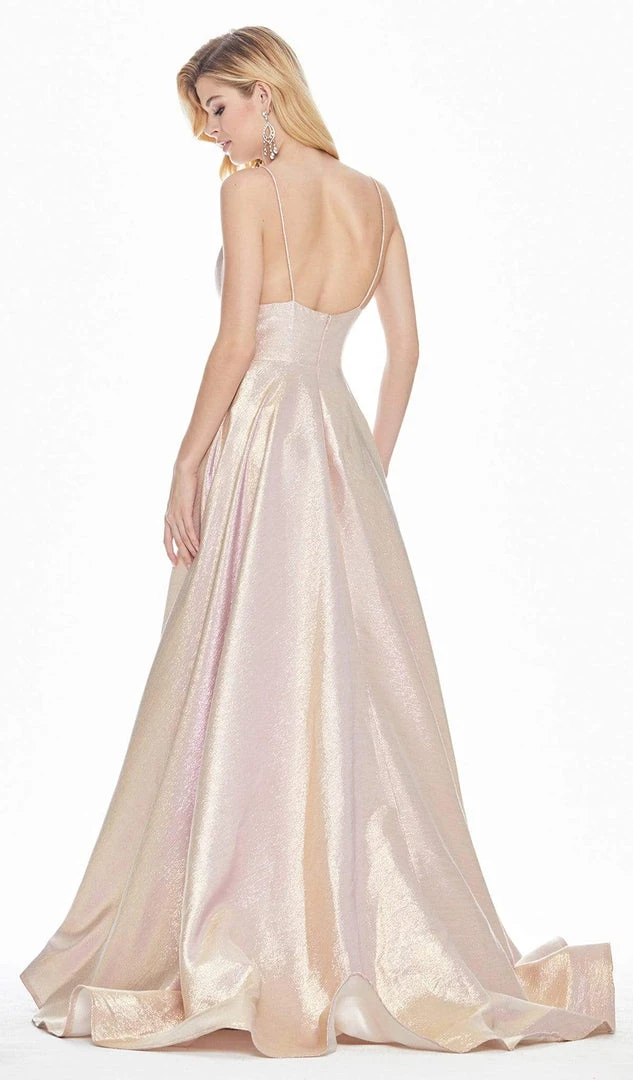 Leave a trail of mesmerized admirers when you show up in this Ashley Lauren 1513 creation. Fascinatingly crafted in a two-toned metallic brocade fabric, this gorgeous piece shows a v-neckline framed with spaghetti straps. Designed with a mid-open back and an embrace of an empire band, the A-line skirt flares dazzlingly down into a gleaming train. Shine with sophistication in this immaculately designed Ashley Lauren masterpiece.