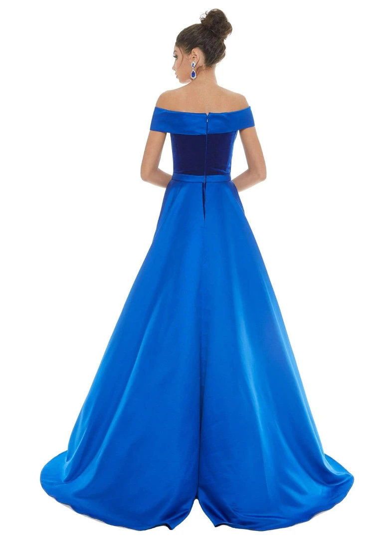 Make a dramatic entrance in this velvet gown by Ashley Lauren 1588. Delights in a charming off the shoulder neckline with a fitted bodice. The full length fitted skirt is designed with a satin overskirt with a train finish. Flatter your finest assets as you enthrall the crowd in this Ashley Lauren creation.