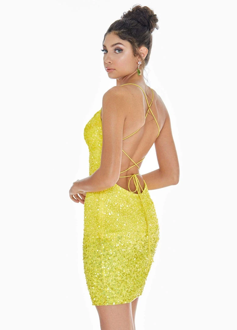 | Details: | Spaghetti Straps, Fully Beaded, Lace Up Design, Plunging Open Back, Back Zipper Closure, Short Hem |