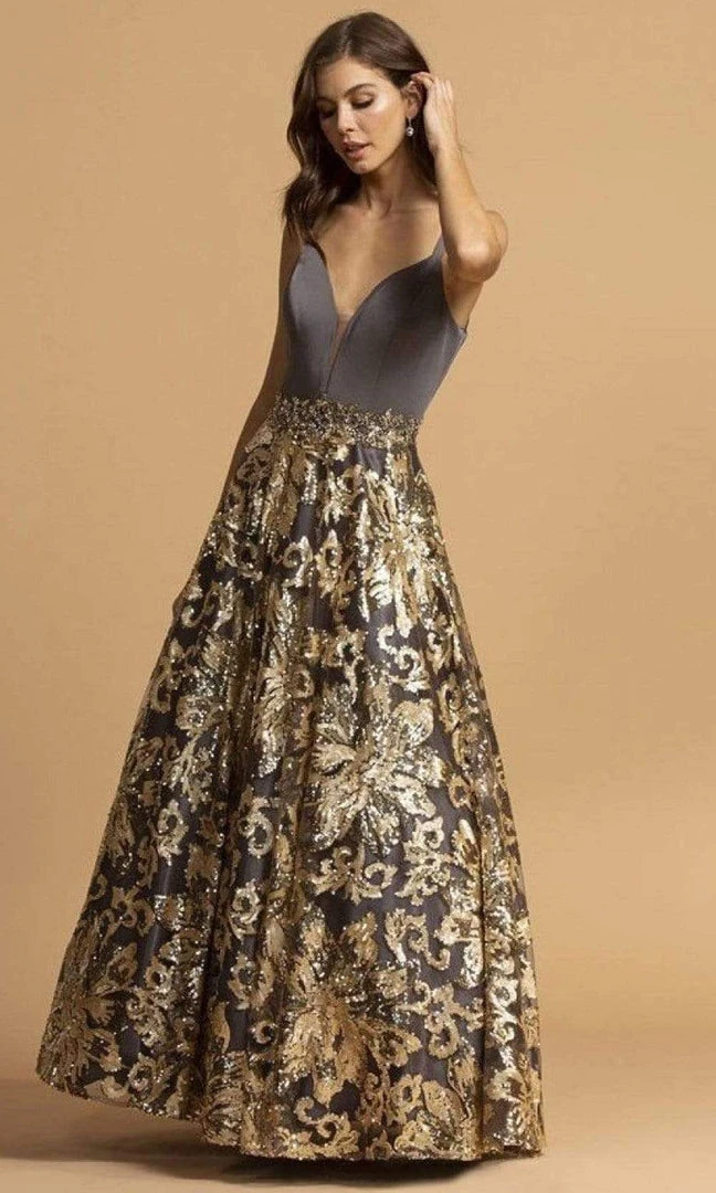 This sleeveless dress features an unadorned bodice with a plunging sweetheart neckline and a tonal inset. Crafted with a low v-open back, metallic lace appliques stream to the floor with a sequin iridescent silhouette.Â