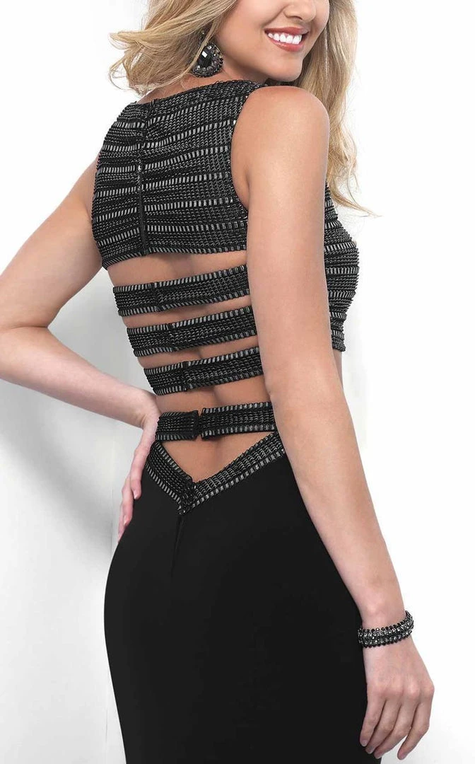 | Details: | Two-Piece, Crop Top, Beaded Bodice, Stripped Cutouts, Embellished Waistband, High Waist Skirt, Back Zipper Closure, Side Slit, Jersey, Sweep Train |