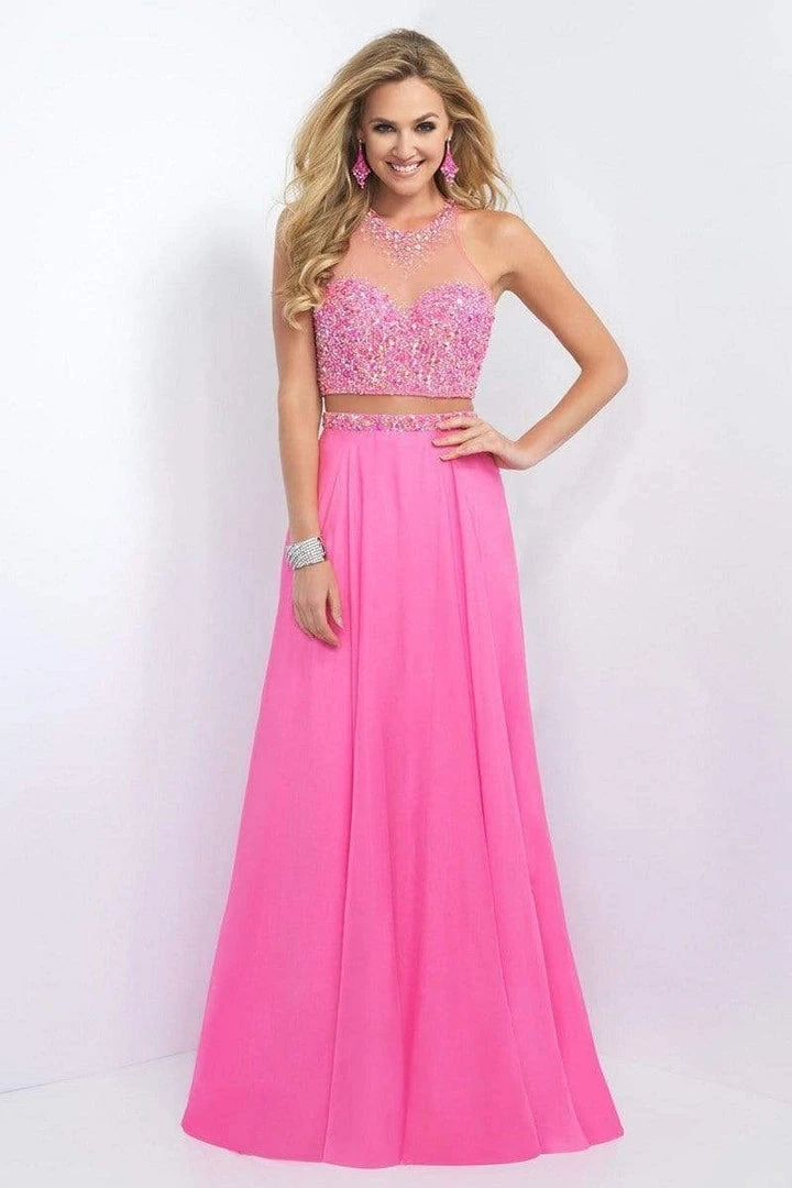 Look marvelous for your next formal affair wearing this two-piece evening gown by Blush 11062. The cropped top has sheer fabric at the upper portion and sparkling stones at the bodice. The midriff is bare. The matching skirt vaunts glittering detail at the top of the waist. The skirt has a gentle A-line silhouette and finishes with a full length hem. This Blush gown is a brilliant pick for any special party.