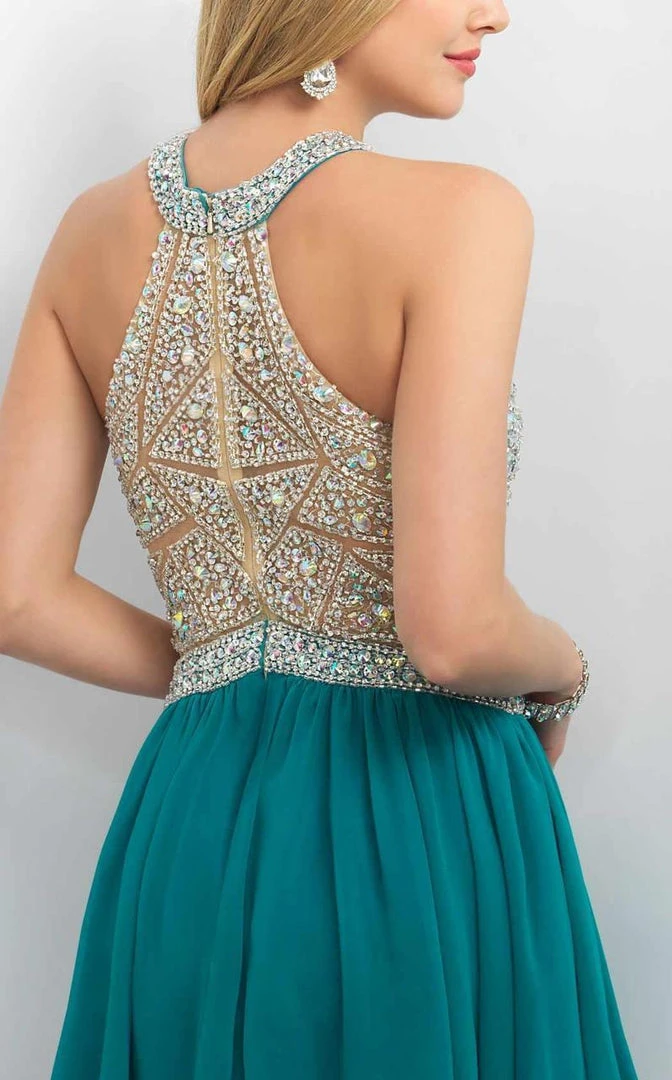 Flaunt your figure in this fantastic cocktail dress by Blush 11164. This dress has a high neckline and a cutout detail at center. Sheer inset works down the center of the bust. An array of gilded beads and stones sit at the fitted bodice. This dress has a nipped waist with a flared silhouette and sheer overlay. This dress finishes with a mini hem. Make them look in this lavish dress by Blush. Model is wearing Tropical Green.