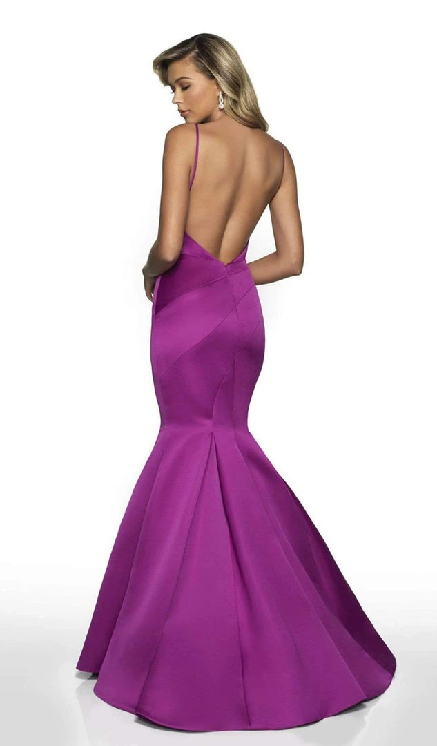 | Details: | Satin, Sleeveless, Low cut neckline, Backless Asymmetric seam lines, Back zipper closure, Brush train |