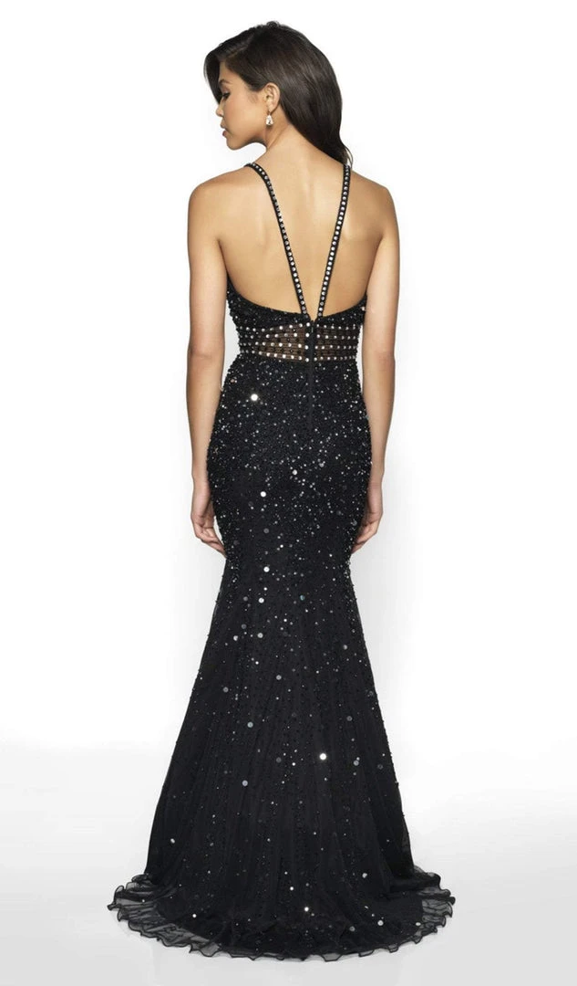 Be entranced with the exceptional phenomena brought by this Flair Prom 19079 creation. Flourishing luminous sequins and beadwork on the entire silhouette, this gorgeous piece shows a deep v-neckline hanging from jeweled spaghetti straps traversing into a mid-open back. Opulently detailed on a sheer peaked empire waist, the mermaid skirt beams with illuminating sequins as it fits and flares into a sweep of train. Glow with elegance and poise while in this Flair Prom masterpiece. Model is wearing the Black color.