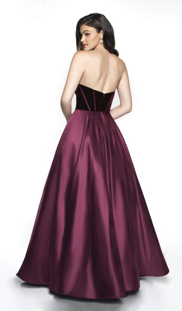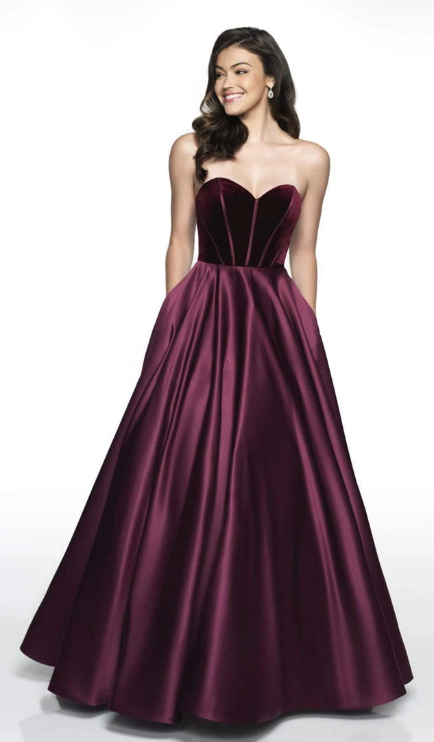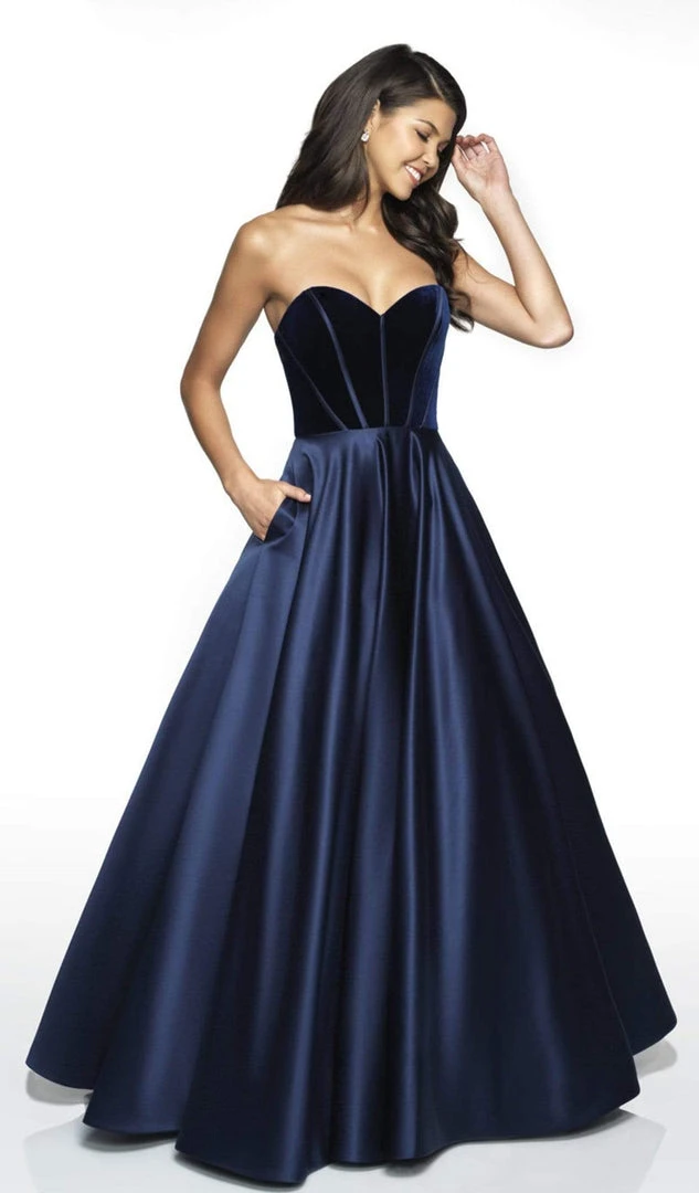 This enchanting gown by Flair Prom 19031 is sure to make you the center of everyones attention. This strapless gown has a velvet corset bodice and sweetheart neckline. The mid-open back has a zipper closure while the full length skirt opens in a voluminous ballgown silhouette. Another great creation by Flair Prom.