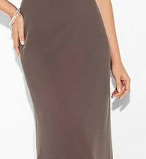 This stretch crepe gown features lace appliques and a slim A-line silhouette. The dress is styled with quarter length sleeves and an illusion jewel neckline with a back keyhole. Model on the image represents the dress in Toast color.