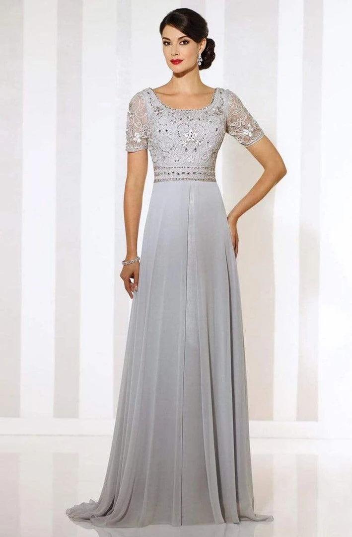 Short sleeve chiffon A-line gown with front and back wide scoop necklines, ribbon work bodice with hand-beaded natural waistband, flyaway skirt with center front split and sweep train.