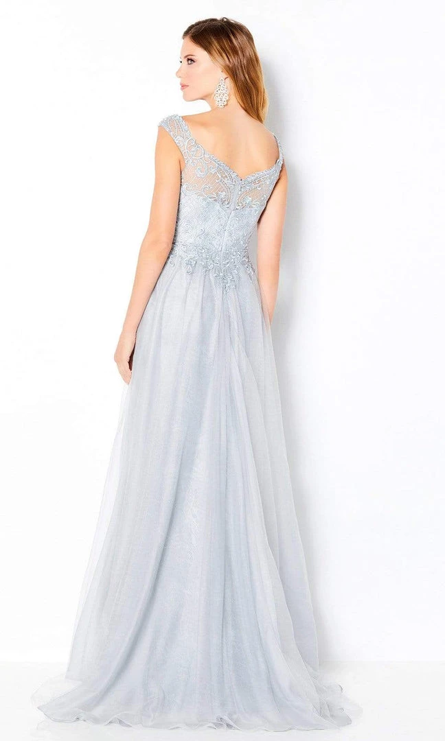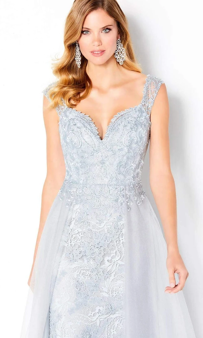 Enchant the stylish crowd with the sumptuous elegance of this Cameron Blake 220640 creation. Exquisite embroidered details and stone accents adorn the figure-sculpting silhouette of this ensemble. Lace tapering straps create a cap sleeve design that borders the sweetheart neckline and its sheer v-back design. Fashioned with a long sheath silhouette, embroidered accents the natural waist and the sheer overskirt that drapes into a sweeping. A complementary shawl comes with this ensemble. Be inspired by the romantic flair of this exquisite Cameron Blake masterpiece. Model is wearing the Ice Blue color.