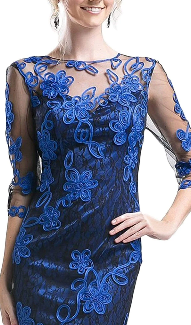 Show off your sweet side in this elegant cocktail dress by Cinderella Divine 1969. This short formal dress is fashioned with sheer overlay atop with lace underlining. The bodice showcases quarter-length sleeves and an illusion jewel neckline. The sheer overlay is adorned with corded applique in floral pattern. This form-fitting ensemble ends with a modest hemline. This Cinderella Divine style is one of those staple looks you can wear for many occasions. Model is wearing a Teal color.