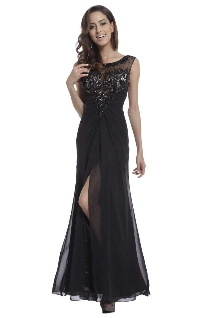 Display your natural beauty with this glamorous Cinderella Divine 954 evening dress. Striking beaded lace design the fitted bodice, crowned with a wide illusion scoop neckline, complemented with a V zipped up back. The front bodice is gathered as the sheath skirt, crafted in chiffon highlights a side slit and falls to a full length hemline. Feel absolutely beautiful with this Cinderella Divine ensemble.