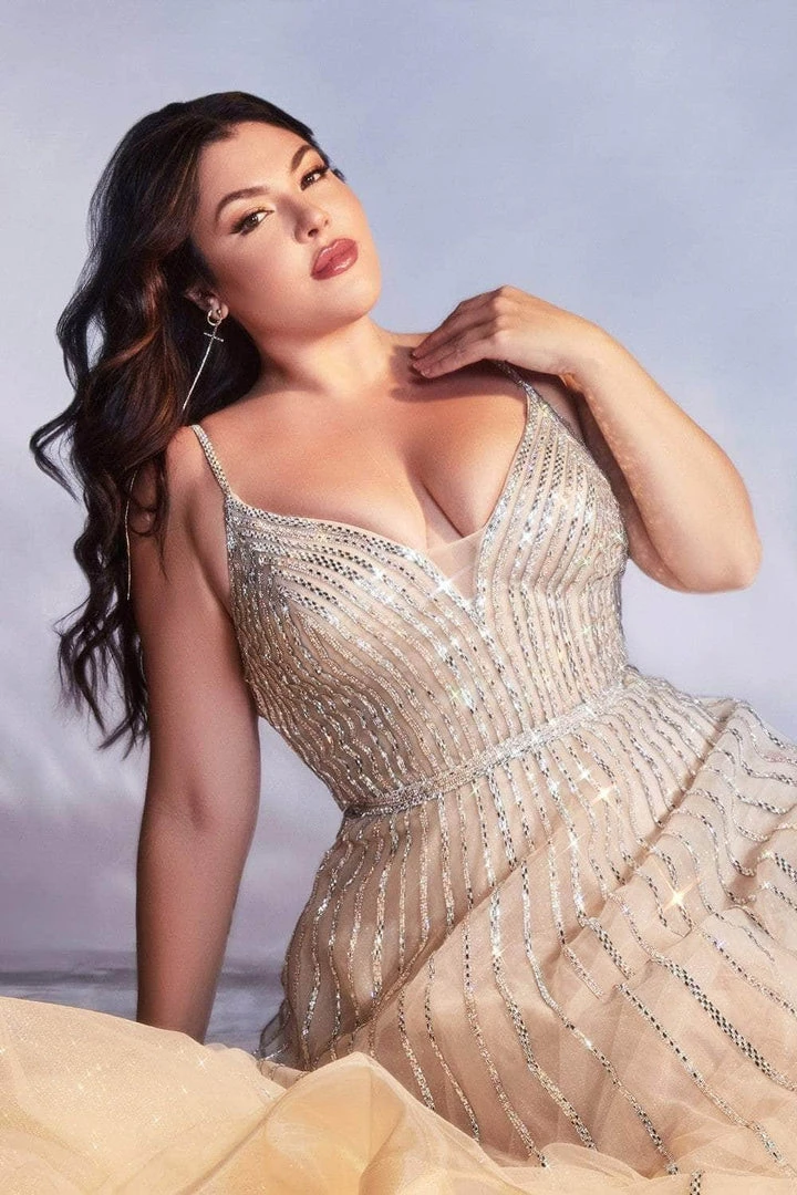 Channel red carpet glamour wearing this Cinderella Divine CD940C. The whole dress is designed with bead embellishments as the fitted bodice showcases a plunging V neckline and strappy open back. The tulle a-line skirt finishes with horsehair and full length hemline. Sparkle in beauty wearing this Cinderella Divine creation.