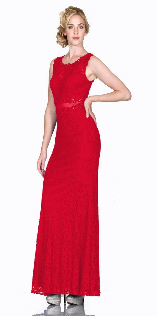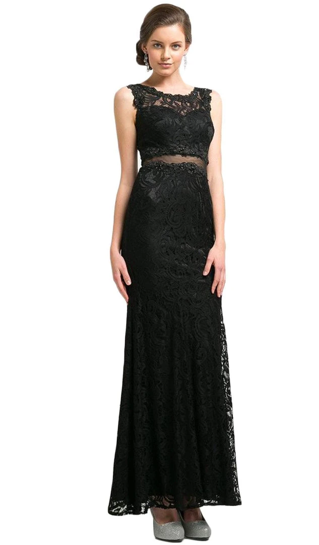 | Details: | Sleeveless, Lace, Scalloped Trims, Rhinestones, Illusion Midriff Panel, Sheer Full Back, Back Zipper Closure, Full-Length Hem |