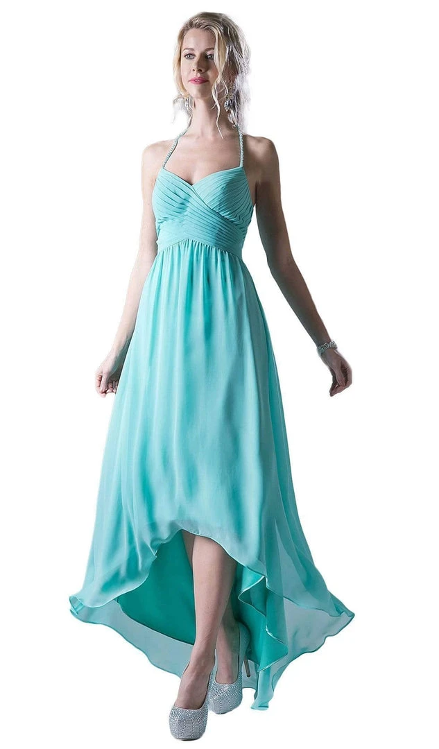 Stand out in every occasion with this daring creation by Cinderella Divine CH528. Features a sleeveless, embellished halter neckline with pleated bodice and a mid-open back. The back has a zipper closure while the skirt opens an A-line silhouette and runs at a high low hemline. Show off in this eccentric design from Cinderella Divine.