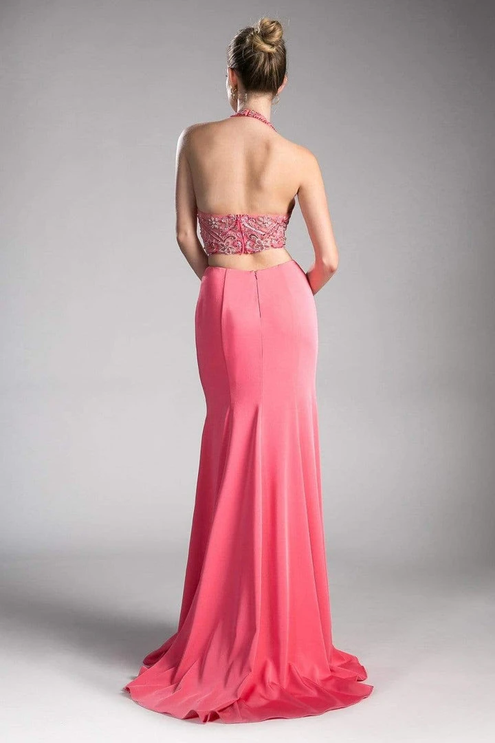 If you are looking for that figure flattering ensemble, this Cinderella Divine 85201 is a perfect pick. An embellished high halter neckline crowns the fitted bodice accentuated with seams. Cutout details at the neckline and waist add sexiness to the stunner as the skirt flares softly to the floor. The back is mid-open while a center zipper closure secures the skirt. A beautiful sweep train finishes this stunner. This Cinderella Divine creation definitely parades the elegant and classy style.