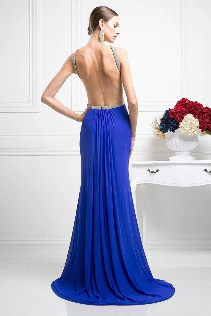Revamp your look with a contemporary evening gown from Cinderella Divine KD019. This scintillating piece is tailored in stretch knit with rhinestone embellished band that trims and frames the bodice. Features a sleeveless halter neckline with front illusion plunging cutout and flaunts a backless style. The sheath skirt cascades to the floor with sweep train, while revealing a high front slit. This striking look from Cinderella Divine is bound to make your social media light up.