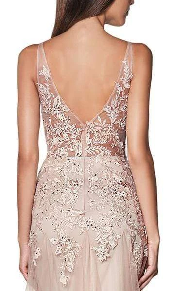 The fitted bodice graces a V neckline supported thin sheer thin straps which leads to the open V back. Beaded lace appliques adorn the dropped bodice as it leads to the pleated trumpet skirt that cascades to full length.