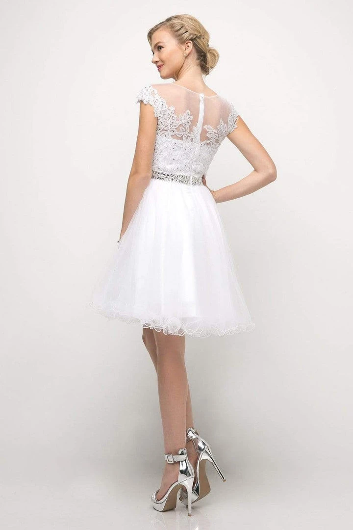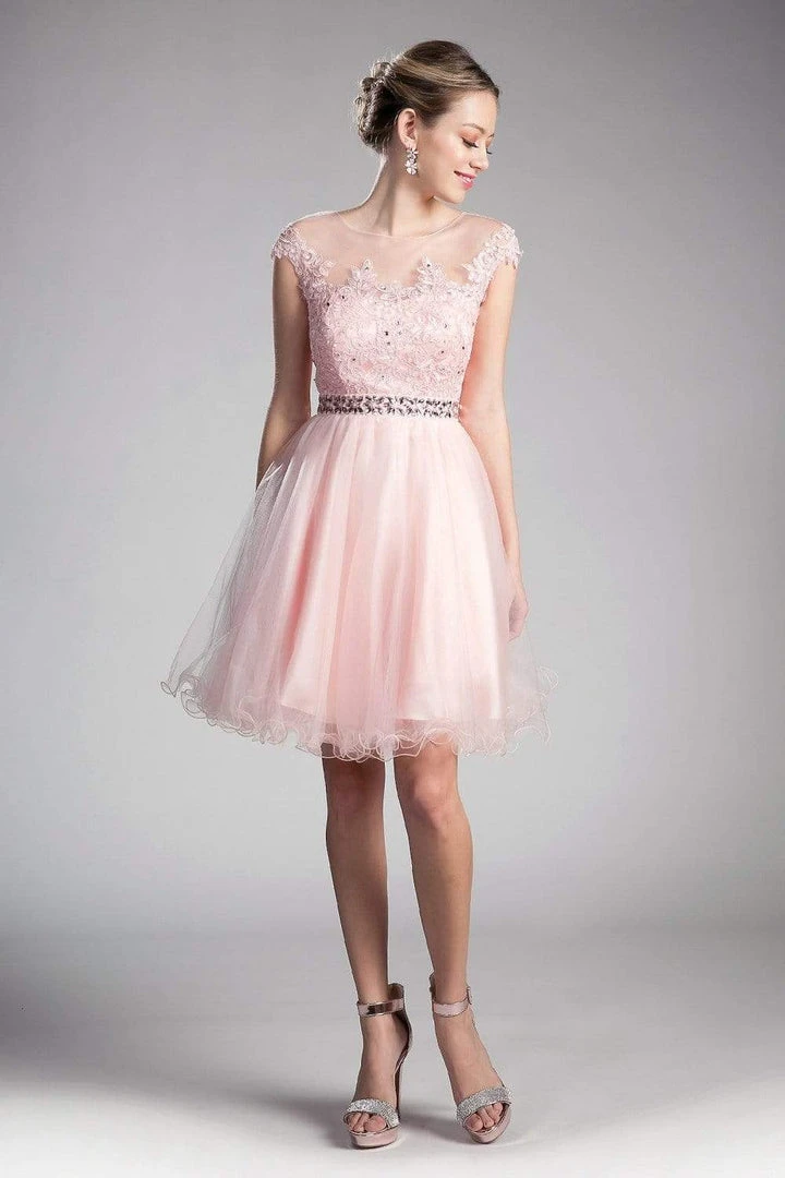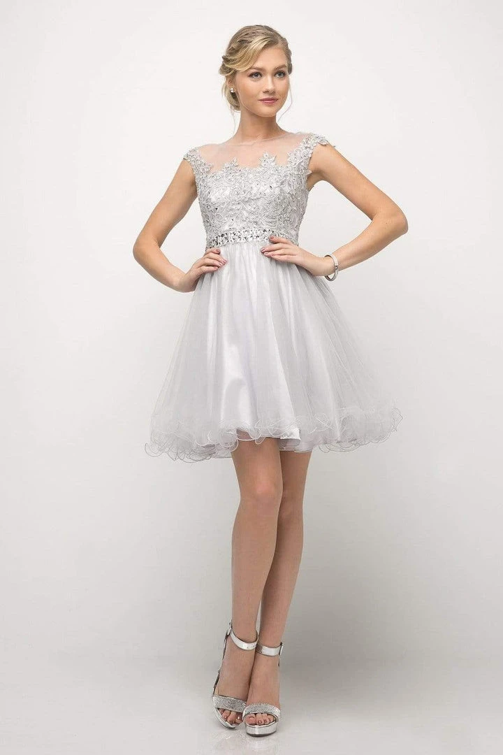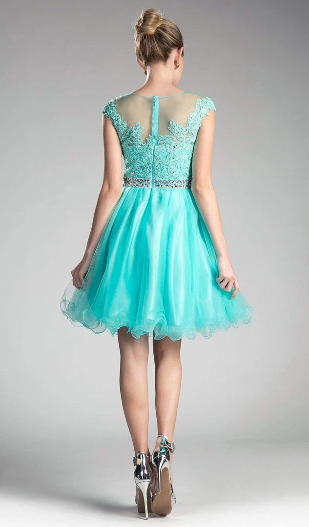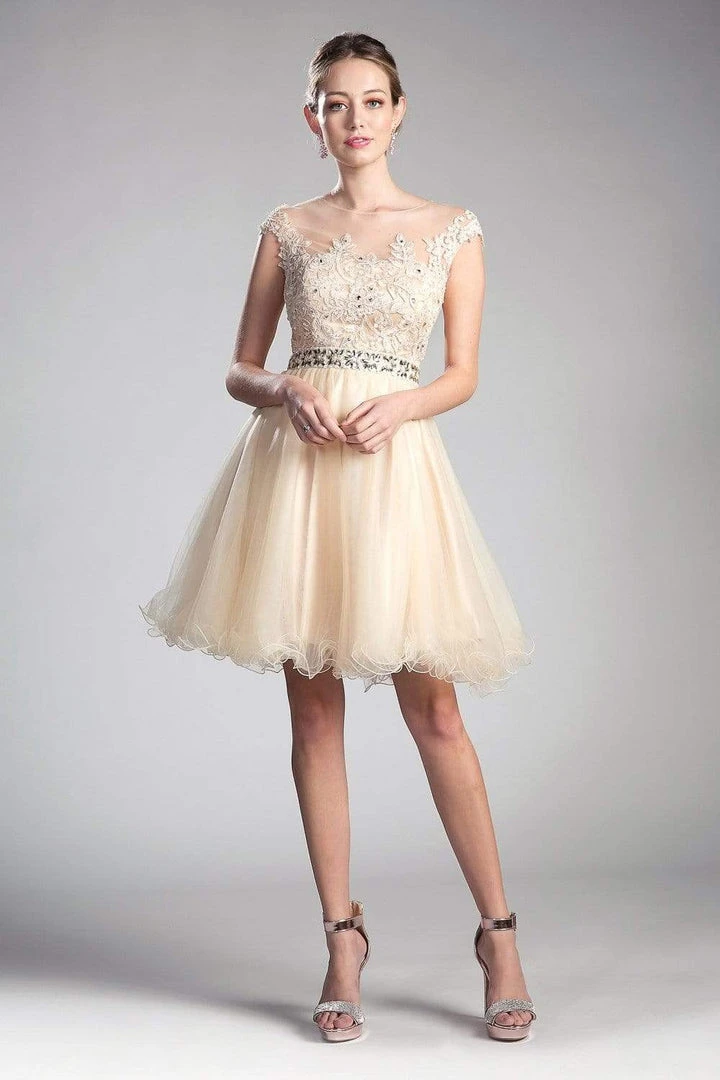 Sassy and stunning, this ruffled cocktail dress by Cinderella Divine UJ0012 is sure to get you noticed. This A-line silhouette party dress features a cap sleeve with sheer shoulders creating an illusion neckline. The bodice is detailed with pretty lace embroidery with sparkling beads and an embellished waistband accent. The short hem rolled-ruffled tulle skirt will let you dance the night away. Enjoy your next special party or event in this short, sassy and stylish party dress by Cinderella Divine.