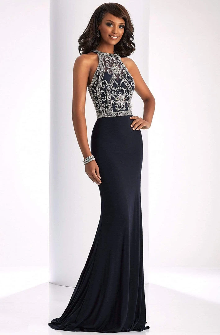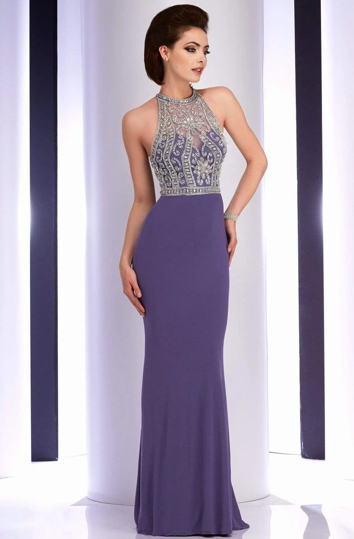 Glow with a sophistication like no other in this gorgeous Clarisse 2807 creation. Embellished with shimmering jewels arranged in an intricate spectacle of scroll and floral on a sheer bodice, this opulent piece shows off a high halter illusion over a sweetheart neckline and a sheer racerback. Shimmering with intricate rhinestones around the natural waist, the stretch taffeta skirt skims down to a flirtatious short hemline. Claim your position at the top of the best dressed list in this ultra-chic Clarisse masterpiece. Model is wearing the Midnight Blue, Marsala and Smoke colors.