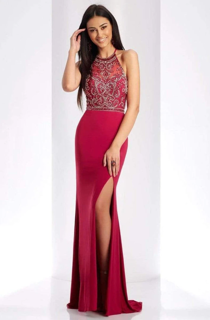 Portray the rich variety in design of this dress by Clarisse 3513. The halter neckline leads to crisscross spaghetti straps across the open back, while the bodice is adorned with sparkling swirls of hand beaded designs. The long fitted skirt has a flirty slit, and small puddle train. This Clarisse creation is truly remarkable! Model is wearing Smoke and Raspberry colors.